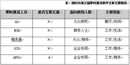 他認(rèn)為,企業(yè)使用即使通訊的溝通是價值的溝通,企業(yè)內(nèi)外部的溝通過程中,不能互聯(lián)互通的溝通障礙將在很大程度上影響企業(yè)內(nèi)外部的信息交流甚至業(yè)務(wù)往來。他提醒筆者關(guān)注一款叫做ANYQ的系統(tǒng),他說,這是他研究以來發(fā)現(xiàn)最有潛力的一款已經(jīng)具備互聯(lián)互通配置的企業(yè)即時通訊軟件。