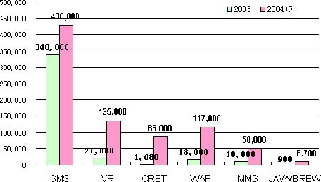 短信業(yè)務(wù)是各類移動(dòng)增值業(yè)務(wù)中用戶量最多的新業(yè)務(wù),2003年已達(dá)到1.4億,WAP、IVR和CRBT業(yè)務(wù)2004年都取得高速增長。其中WAP用戶規(guī)模達(dá)到2500萬,其市場規(guī)模由2003年的1.8億元增長為2004年的11.7億元。