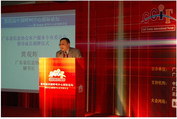 由廣東省信息協(xié)會(huì)、廣東省電子商務(wù)協(xié)會(huì)聯(lián)合主辦,廣東省信息協(xié)會(huì)客戶(hù)服務(wù)專(zhuān)業(yè)委員會(huì)、廣州市品派文化傳播有限公司策劃承辦,AVAYA公司總協(xié)辦的第四屆中國(guó)呼叫中心國(guó)際論壇于2007年1月23日在廣州亞洲國(guó)際大酒店隆重舉行,廣東省信息產(chǎn)業(yè)廳副廳長(zhǎng)俞建飛出席會(huì)議并致開(kāi)幕詞。會(huì)上,廣東省信息協(xié)會(huì)秘書(shū)長(zhǎng)黃觀輝、AVAYA公司銷(xiāo)售總經(jīng)理?xiàng)畛、民生銀行電子銀行部華南運(yùn)營(yíng)中心總經(jīng)理李濤、網(wǎng)易客戶(hù)服務(wù)部總監(jiān)張?jiān)频确謩e做了主題發(fā)言。來(lái)自全國(guó)各地300多位企業(yè)管理人員參加了本次論壇。