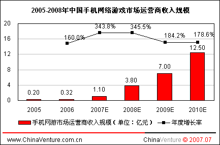 ChinaVenture分析師指出,除2006年觸通安騰和掌上明珠依靠手機(jī)網(wǎng)游業(yè)務(wù)獲得數(shù)百萬美元投資外,其余企業(yè)獲融資原因均為投資商看好手機(jī)單機(jī)游戲業(yè)務(wù)。2007年之前由于手機(jī)網(wǎng)游市場規(guī)模過小,加上無線網(wǎng)絡(luò)環(huán)境制約,風(fēng)險(xiǎn)投資商大多抱以觀望態(tài)度。