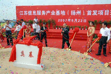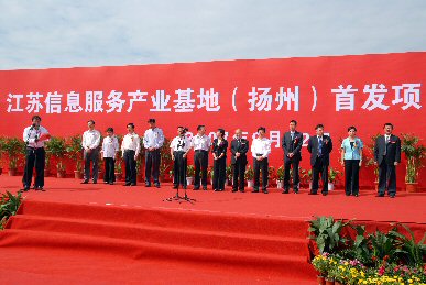 日前,江蘇信息服務(wù)產(chǎn)業(yè)基地(揚(yáng)州)首發(fā)項(xiàng)目開工典禮在廣陵新城隆重舉行,這標(biāo)志著產(chǎn)業(yè)基地建設(shè)邁入了實(shí)質(zhì)性階段。揚(yáng)州市人民政府市長王燕文和天津泰達(dá)公司董事長劉惠文為奠基石揭幕,市委常委、常務(wù)副市長王榮平致賀詞,江蘇省信息產(chǎn)業(yè)廳副廳長龔懷進(jìn)出席了開工典禮。