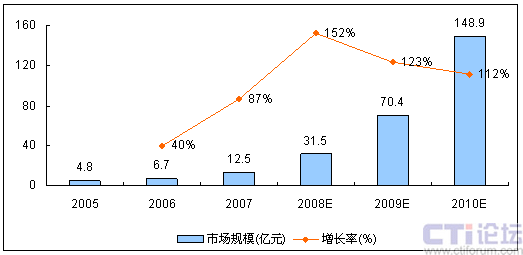 圖 2005-2010年中國(guó)移動(dòng)即時(shí)通信市場(chǎng)規(guī)模及預(yù)測(cè)