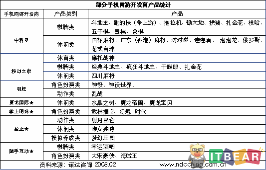 目前國(guó)內(nèi)市場(chǎng)上運(yùn)行的手機(jī)網(wǎng)游不下百種,單就手機(jī)網(wǎng)游開(kāi)放來(lái)說(shuō),國(guó)內(nèi)還沒(méi)有哪家或哪幾家開(kāi)發(fā)商控制占據(jù)絕對(duì)優(yōu)勢(shì)的局面。下表列出了幾家手機(jī)網(wǎng)游開(kāi)發(fā)商開(kāi)發(fā)的手機(jī)網(wǎng)游產(chǎn)品。從表中可以看出中科奧開(kāi)發(fā)的產(chǎn)品數(shù)量較多(18款),主要產(chǎn)品為棋牌與休閑類(lèi)小游戲。其他的開(kāi)發(fā)商開(kāi)發(fā)的手機(jī)網(wǎng)游產(chǎn)品數(shù)量在2—5款之間,多為大型游戲。從游戲品種的不同可以看出主要開(kāi)發(fā)商的研發(fā)方向有所區(qū)別。