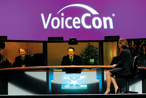 John Chambers和美國前副總統(tǒng)Al Gore利用網(wǎng)真系統(tǒng)參與VoiceCon大會