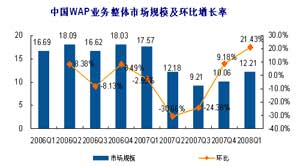中國(guó)WAP業(yè)務(wù)整體市場(chǎng)規(guī)模及環(huán)比增長(zhǎng)率(來(lái)源:易觀(guān)國(guó)際)