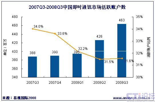 2008年第3季中國即時(shí)通訊活躍帳戶數(shù)達(dá)4.63億
