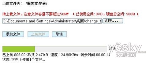 相對而言189在網絡硬盤功能方面則優(yōu)越很多,除了硬盤空間的容量外,支持上傳文件的進度條顯示,而且上傳速率也不錯,基本穩(wěn)定保持在120KB/s。