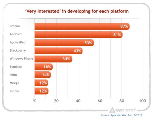 根據(jù)報(bào)道,在2010年1月,有86%的開發(fā)者非常有興趣開發(fā)iPhone應(yīng)用程序,而68%的開發(fā)者非常有興趣開發(fā)Android程序,差距是18%。而在3月時(shí),這個(gè)差距縮小到6%(iPhone 87%、Android 81%,iPad是53%)。