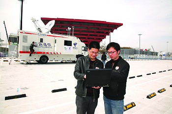 中國(guó)電信的應(yīng)急衛(wèi)星通信車抵達(dá)中國(guó)館,為世博會(huì)開(kāi)幕護(hù)航。