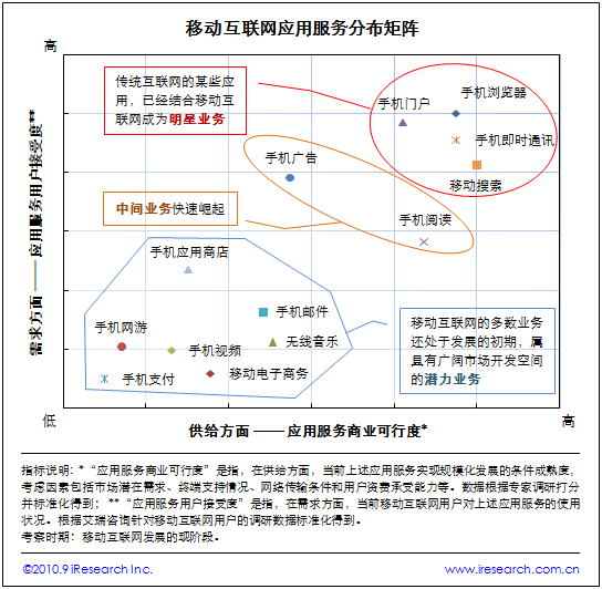 根據(jù)艾瑞咨詢近期發(fā)布的《2009-2010年中國移動互聯(lián)網(wǎng)行業(yè)發(fā)展報(bào)告》,移動互聯(lián)網(wǎng)各應(yīng)用服務(wù)在“應(yīng)用服務(wù)商業(yè)可行度”和“應(yīng)用服務(wù)用戶接受度”兩個(gè)維度上被劃分為“明星業(yè)務(wù)”、“中間業(yè)務(wù)”和“潛力業(yè)務(wù)”三個(gè)類型。具備一定規(guī)模化發(fā)展市場條件,但還面臨若干限制因素的移動互聯(lián)網(wǎng)業(yè)務(wù),將在未來逐步打開市場。