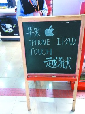 在北京某家樂福商場外的數(shù)碼店,給iPhone“越獄”的廣告牌格外醒目。