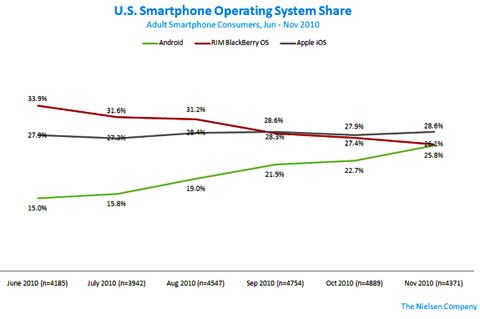 報(bào)告顯示,谷歌Android的市場份額為25.8%,繼續(xù)穩(wěn)步蠶食蘋果的市場份額。曾經(jīng)一度領(lǐng)跑的RIM黑莓操作系統(tǒng)則繼續(xù)下滑,市場份額降至26.1%。去年6月的時(shí)候,黑莓曾以33%的市場份額遙遙領(lǐng)先于蘋果和谷歌。