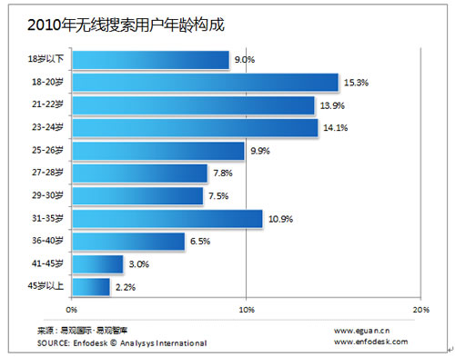 據(jù)Enfodesk易觀智庫近期發(fā)布的研究表明:中國無線搜索市場用戶結(jié)構(gòu)在2010年已經(jīng)發(fā)生巨大變化。對(duì)比2009年數(shù)據(jù)來看,無線搜素用戶在性別、年齡、職業(yè)分布方面,已經(jīng)發(fā)生快速的變化。