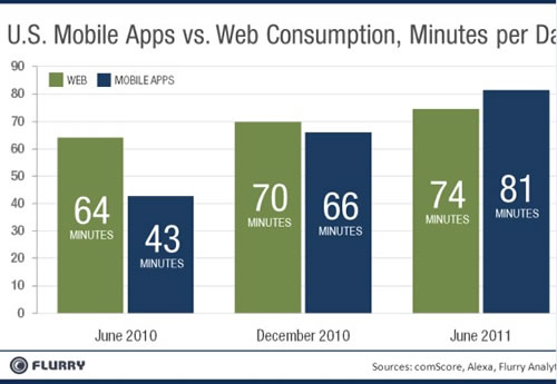 Flurry發(fā)現(xiàn)平均每用戶花在移動應(yīng)用上的時間比網(wǎng)絡(luò)多出9%。僅在1年前,用戶平均每天在應(yīng)用上花費(fèi)43分鐘,在網(wǎng)絡(luò)上花費(fèi)64分鐘。而現(xiàn)在,用戶在應(yīng)用上的時間增至81分鐘,增幅達(dá)91%。原因?yàn)橛脩羰褂玫膽?yīng)用類型和數(shù)量增加,而非平均時長有大幅增加。花在網(wǎng)絡(luò)上的時間增速較緩,目前為74分鐘,同比增長16%。
