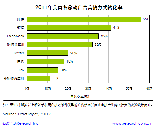 iResearch艾瑞咨詢整理ExactTarget調(diào)研數(shù)據(jù)時發(fā)現(xiàn):2011年在驅動美國手機用戶產(chǎn)生購買的移動廣告營銷方式中,電子郵件營銷的轉化率最高,達到56%,短信、Facebook、購物類手機應用(如Amazon、eBay、Groupon)以41%、35%、32%的轉化率依次位居二、三、四位。