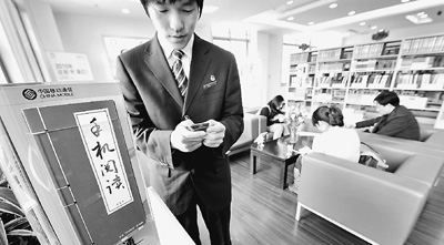 2010年4月16日下午,國內(nèi)首個(gè)G3閱覽室在杭州市下城區(qū)圖書館內(nèi)建成并免費(fèi)開放,實(shí)現(xiàn)了移動信息技術(shù)與公共圖書館的有機(jī)結(jié)合。圖為讀者正在G3閱覽室里通過G3手機(jī)閱讀器免費(fèi)閱讀。