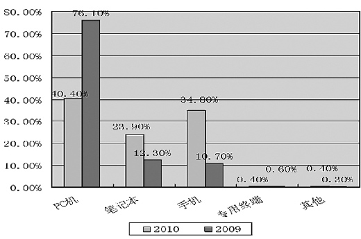 以手機(jī)為閱讀載體的比例從2009年的10.7%激增到2010年的34.8%。相比之下,PC機(jī)閱讀則出現(xiàn)了大幅度地滑落,從2009年的76.1%下降到2010年的40.4%。可見,大部分通過PC機(jī)閱讀的讀者更加傾向或習(xí)慣于手機(jī)閱讀。