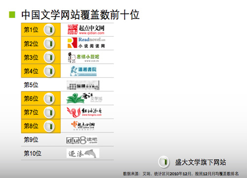 根據(jù)艾瑞咨詢(xún)的數(shù)據(jù),中國(guó)文學(xué)網(wǎng)站覆蓋人數(shù)最多的前8個(gè)文學(xué)網(wǎng)站中,盛大旗下文學(xué)網(wǎng)站占了7個(gè),包括排名第一的起點(diǎn)中文網(wǎng)等。