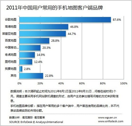 CTI論壇(ctiforum)11月25日消息(記者 潘婷婷): 據(jù)EnfoDesk易觀智庫最新發(fā)布的《2011中國手機地圖導航用戶調(diào)研報告》顯示,谷歌地圖、高德地圖及諾基亞地圖分別以87.6%、46.8%及44.7%的份額,占據(jù)2011年用戶最常用的手機地圖客戶端品牌份額(指在用戶常用的多個客戶端中,用戶首選使用的品牌比例,并不代表該品牌實際的市場份額,實際市場份額參見《2011年第3季度中國手機地圖客戶端市場監(jiān)測報告》)前三名的位置。