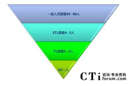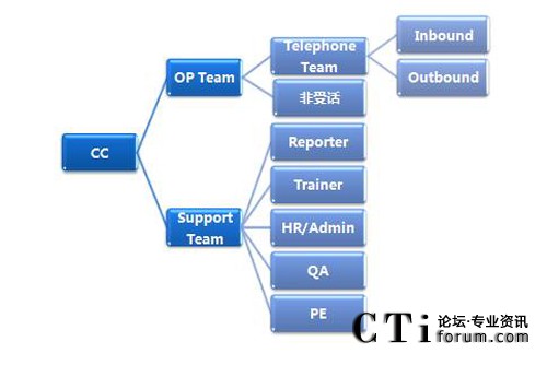 呼叫中心的組織結(jié)構(gòu)和人員構(gòu)成,按照橫向切面來看,分別存在有:一線、二線(值班長)、TL、SV、OM等職位,按照縱向切面來看,分別存在有:運營團(tuán)隊和支撐團(tuán)隊,運營團(tuán)隊包括有:受話團(tuán)隊(Inbound和Outbound)、非受話團(tuán)隊,支撐團(tuán)隊包括有:報表專員、培訓(xùn)專員、人事行政專員、質(zhì)控專員、流程工程師等崗位。圖形展示為: