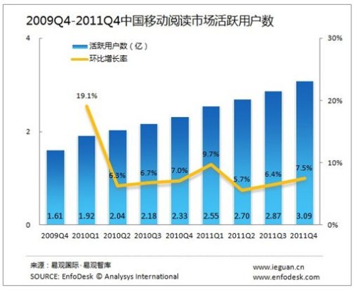 據(jù)EnfoDesk易觀智庫最新數(shù)據(jù)顯示,2011年第4季度中國手機(jī)閱讀市場活躍用戶數(shù)達(dá)3.09億,環(huán)比增長7.46%,同比增長33%。