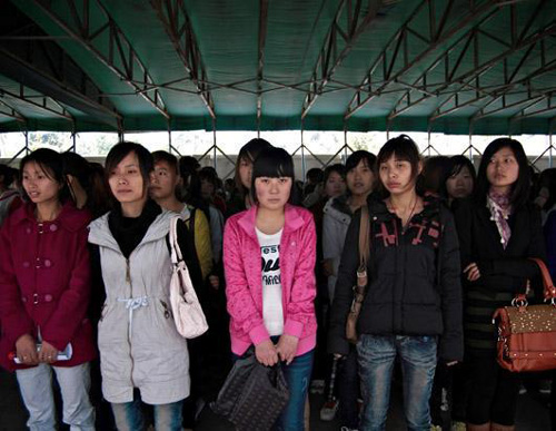在一個周一上午,約3000名外來工人在深圳的富士康招聘中心門前,希望獲得在富士康的工作機(jī)會。