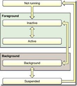 為了節(jié)約電池的電量,智能手機(jī)上的操作系統(tǒng)的一個(gè)基本策略是,盡量減少正在運(yùn)行的程序,這個(gè)道理很簡單,運(yùn)行的程序越多,需要耗費(fèi)的 CPU 計(jì)算時(shí)間就越多,電量就省不下來。下面的圖是蘋果 iOS 設(shè)備應(yīng)用程序調(diào)度狀態(tài)圖,事實(shí)上蘋果設(shè)備是除了用戶正在操作的程序,其他打開的程序進(jìn)程盡可能都放到“掛起(Suspended)”的狀態(tài)下。在“掛起”的狀態(tài)下面,程序進(jìn)程處在休眠狀態(tài),不耗費(fèi) CPU 計(jì)算能力。當(dāng)用戶沒有對設(shè)備進(jìn)行操作的時(shí)候,整個(gè)系統(tǒng)處在休眠的低電狀態(tài)。(這里進(jìn)程的意思是:程序運(yùn)行實(shí)例)
