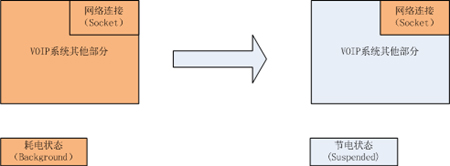 2、程序配置用于 VOIP 業(yè)務(wù)的網(wǎng)絡(luò)連接(Socket),告知系統(tǒng),在程序進(jìn)程被調(diào)度到“掛起(Suspended)”狀態(tài)時(shí)該特殊的網(wǎng)絡(luò)連接需要被系統(tǒng)接管,因此,此時(shí)網(wǎng)絡(luò)連接仍然是活動(dòng)的。當(dāng)網(wǎng)絡(luò)連接有新的數(shù)據(jù)到達(dá)的時(shí)候,程序?qū)摹皰炱穑⊿uspended)” 狀態(tài)被喚醒到“后臺 (Background)”狀態(tài),如果是個(gè)來電事件,VOIP應(yīng)用則發(fā)起一個(gè)本地提醒事件,此時(shí)用戶可以在設(shè)備的界面上看到來電提醒,如果用戶選擇接聽來電,則 VOIP 應(yīng)用被調(diào)度到前端的“活動(dòng) (Active)”狀態(tài)直接與用戶交互,否則,回退到低電的“掛起(Suspended)”狀態(tài)。下圖可以看到左圖是傳統(tǒng)的 VOIP 應(yīng)用,在“待機(jī)”狀態(tài)下整個(gè)程序都運(yùn)行在耗電的“后臺 (Background)”狀態(tài),右圖是蘋果的 VOIP 實(shí)現(xiàn),僅僅網(wǎng)絡(luò)連接運(yùn)行在耗電的“后臺 (Background)”狀態(tài)。其余系統(tǒng)部分運(yùn)行在低電的“掛起(Suspended)”狀態(tài)。