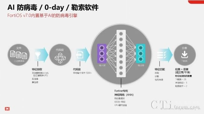 目前,AI技術已深度融入Fortinet的數(shù)十種產(chǎn)品與方案中。在最新版的統(tǒng)一網(wǎng)絡安全操作系統(tǒng)FortiOS 7.6中,就已經(jīng)內置了由FortiGuard AI實驗室研發(fā)的基于AI的防病毒引擎。該引擎運用神經(jīng)網(wǎng)絡技術,學習并區(qū)分海量病毒文件與正常文件,通過分類打分的方式,實現(xiàn)對未知文件與病毒的精準判斷,無需依賴傳統(tǒng)的病毒特征庫。因此,F(xiàn)ortinet的FortiGate等產(chǎn)品在防病毒方面擁有雙引擎加持,既有傳統(tǒng)的基于病毒特征庫的防病毒引擎,又有基于AI的下一代防病毒引擎(Anti-virus NGAV),雙重保障,安全無憂。