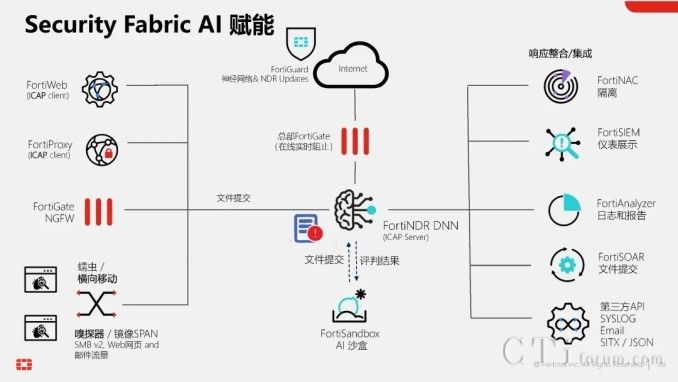 此外,AI技術還貫穿于Fortinet的多個產(chǎn)品與功能中,形成高效的工作流。以威脅檢測與響應為例,當FortiGate的雙引擎也無法確定某個文件的合法性時,它可以將該文件提交給FortiNDR進行深度分析,利用云端深度神經(jīng)網(wǎng)絡AI進行0 Day攻擊、勒索軟件等深層次分析。若仍無法確定,還可進一步提交給FortiSandbox,在虛擬機環(huán)境中進行模擬操作,進行更為深入的檢測。在這一系列流程與技術的支持下,F(xiàn)ortinet的威脅檢測與響應能力已達到業(yè)界頂尖水平,向滿分100分邁進。