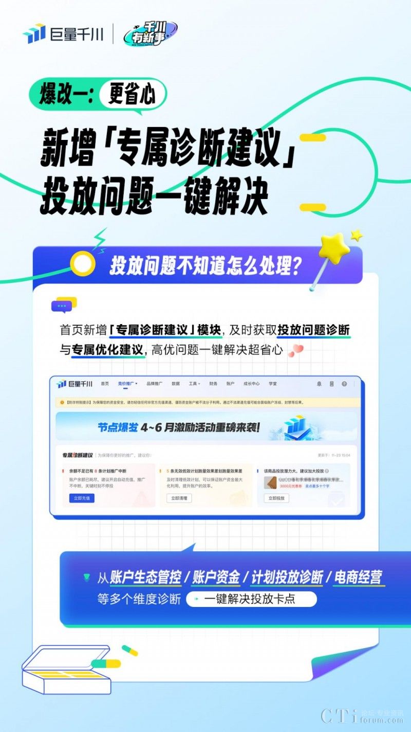 近期,為直面商家投放困境,全面提升投放效率,巨量千川PC端首頁全新推出四大重磅升級——上線「專屬診斷建議」、「數(shù)據(jù)看板」、「重磅產品推薦」和「平臺動態(tài)」,助力商家更便捷、更從容地提升投放質量和效果,高效推動生意增長!