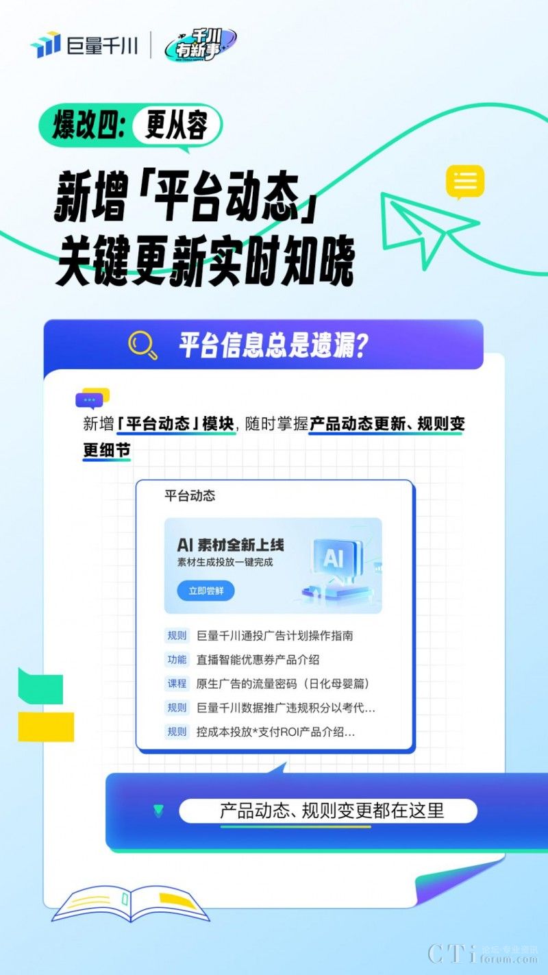 巨量千川首頁升級還增設了「平臺動態(tài)」模塊,實時呈現(xiàn)平臺產品更新、規(guī)則變更等信息,讓商家可以及時了解平臺最新動態(tài),把握生意增長機遇。