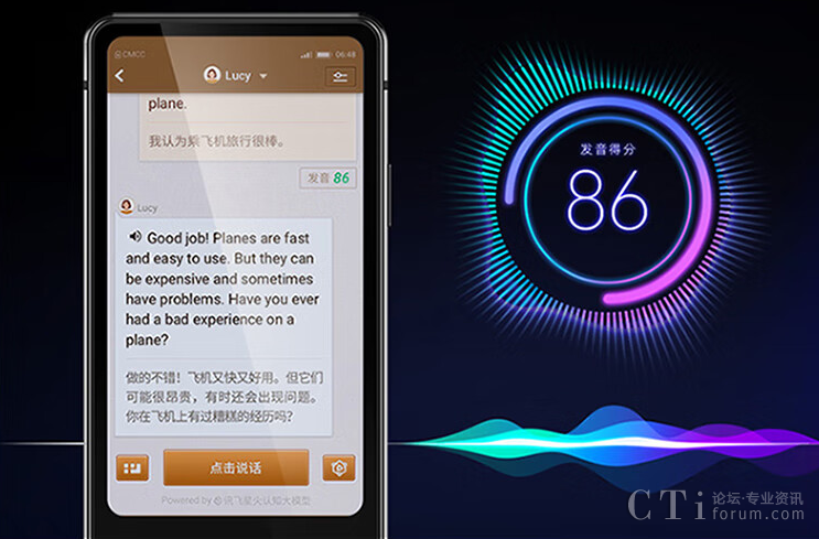 AI教練可以隨時隨地和用戶一對一地聊天,并會將聊天內容用中英文對照的方式顯示在屏幕上,同時還會對用戶的口語發(fā)音進行智能打分。