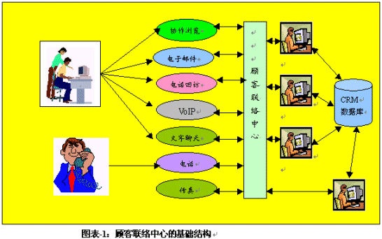 。。呼叫中心通過多年以來的發(fā)展,其傳統(tǒng)型的呼叫中心還是主要在以電話為媒介服務于顧客。這類呼叫中心的基礎結構包括ACD、IVR、CTI等技術應用平臺和界面,同時與企業(yè)的后臺資源相連接,例如大型或相關數(shù)據(jù)庫。但是,當今的呼叫中心已經發(fā)展成為一個多媒體的服務或交易渠道,有的還能處理基于互聯(lián)網(wǎng)的垂詢和呼叫,而有的則是一個虛擬的顧客聯(lián)絡中心,例如圖表-1中描述的那樣: