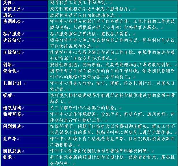 附錄6提供了建議的員工滿意度調(diào)查表?梢宰鳛闇(zhǔn)備制訂呼叫中心使用的版本的起點。在制訂表格時,應(yīng)從所有中心最佳實踐工作和領(lǐng)導(dǎo)團隊確認(rèn)的其他部門取得評估要素。表格6總結(jié)了呼叫中心員工滿意度調(diào)查應(yīng)包含的主要方面: