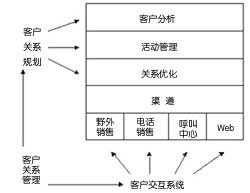 真正的CRM解決方案是一個(gè)復(fù)雜的聯(lián)合體,它由許多組件(即分析工具、活動(dòng)管理與事件引發(fā)等)與許多需要用來達(dá)到一對(duì)一的營(yíng)銷能力(如間接管理、基于規(guī)章制度的工作流管理以及真正的渠道管理等)的新組件共同組成。此外,在非客戶聯(lián)系系統(tǒng)(如企業(yè)資源規(guī)劃與操作)與客戶聯(lián)系系統(tǒng)之間必須有接口。最后,在企業(yè)內(nèi)建立一套完整的便于知識(shí)管理的反饋循環(huán)系統(tǒng)也很必要。