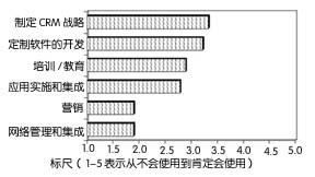 通常,通信提供商相對(duì)而言不愿意求助于專業(yè)服務(wù)公司來(lái)幫助其實(shí)施CRM解決方案。在1~5的標(biāo)尺中,只有積分為5的公司可能使用專業(yè)服務(wù)公司,分?jǐn)?shù)低于3.5的公司沒(méi)有一家會(huì)這么做,這表明通信提供商仍由內(nèi)部人員來(lái)實(shí)施多數(shù)功能。調(diào)查的分?jǐn)?shù)表明他們最可能與外部服務(wù)提供商合作制定戰(zhàn)略——定制軟件開(kāi)發(fā)(3.33)和培訓(xùn)(3.22)。他們最不可能求助此類公司來(lái)從事網(wǎng)絡(luò)管理和集成(1.89)或營(yíng)銷(1.89)工作。圖3顯示的就是這些調(diào)查結(jié)果。