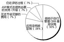 據(jù)圖4顯示,多數(shù)被調(diào)查者目前都沒(méi)有依賴ASP,而是由內(nèi)部機(jī)構(gòu)來(lái)管理客戶管理解決方案。大量的被調(diào)查者聲稱他們不想從ASP那里租用客戶許可證。10%的被調(diào)查者表示他們不會(huì)與ASP合作實(shí)施CRM解決方案。