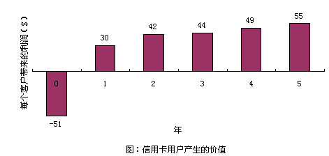 以信用卡服務(wù)為例,爭(zhēng)取一個(gè)新的用戶平均要51美圓,用于廣告、推銷和開戶等開支。用戶開始時(shí)花錢很少,但為公司帶來(lái)一定的利潤(rùn)。但如果用戶繼續(xù)使用到第二年,就會(huì)為公司帶來(lái)更多的經(jīng)濟(jì)效益,因?yàn)楣九c客戶之間的信任和客戶對(duì)公司的滿意,致使客戶更多地通過(guò)信用卡消費(fèi)。(圖:"信用卡用戶產(chǎn)生的價(jià)值")用戶貢獻(xiàn)在增加,公司的運(yùn)作費(fèi)用卻在不斷減低。信用卡公司可以不斷減少對(duì)客戶信用的審核時(shí)間。保持長(zhǎng)期的客戶關(guān)系,還可以減少?gòu)V告支出,客戶本身就是一個(gè)免費(fèi)的廣告資源。很多人在消費(fèi)前喜歡聽取朋友的意見,覺得比廣告更可信。