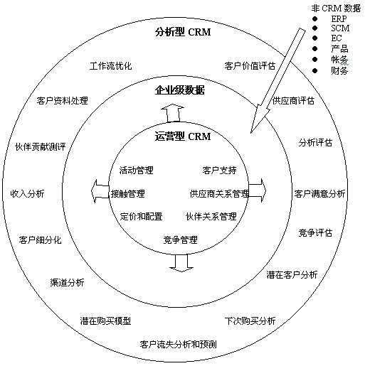 分析型CRM的360度視圖在優(yōu)化有意義的互動(dòng)和個(gè)性化接觸的基礎(chǔ)上,重視公司通過(guò)所有渠道與客戶(hù)的交流;而不管這種優(yōu)化是通過(guò)一個(gè)新的營(yíng)銷(xiāo)競(jìng)爭(zhēng)或分析一個(gè)呼叫者的抱怨歷史實(shí)現(xiàn)。這為公司提供了更細(xì)的客戶(hù)細(xì)分能力和部署真正的“一對(duì)一”的客戶(hù)交流的能力。具有“運(yùn)營(yíng)型” CRM與“分析型”CRM能力的公司,正將它們的企業(yè)戰(zhàn)略轉(zhuǎn)向: