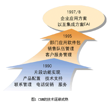 ----二是CRM的技術(shù)逐漸走向成熟(見圖1)。1990年左右,CRM方案只是片斷功能的實現(xiàn),到1995年以來、1997/8年以來,逐漸出現(xiàn)了部門級應用軟件包、企業(yè)級應用方案。有些企業(yè)甚至已經(jīng)開始關(guān)心自己原有的ERP系統(tǒng)與正在建設的CRM系統(tǒng)之間的集成問題。