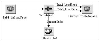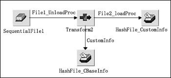 客戶信息數(shù)據(jù)庫(kù)中的各表以客戶編碼為關(guān)鍵字進(jìn)行關(guān)聯(lián),客戶編碼是由客戶的證件號(hào)碼經(jīng)過專門的算法計(jì)算產(chǎn)生的唯一客戶標(biāo)識(shí)。根據(jù)各個(gè)系統(tǒng)中客戶數(shù)據(jù)與新系統(tǒng)客戶信息的對(duì)照關(guān)系我們?cè)O(shè)計(jì)數(shù)據(jù)抽取轉(zhuǎn)換的程序,如圖4所示是一個(gè)DataStage的Job。