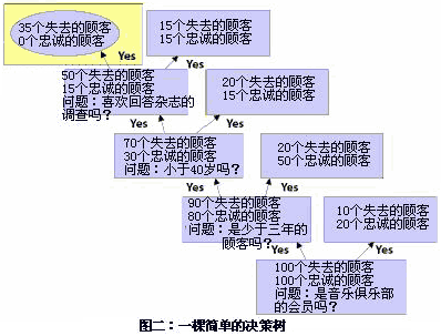 你可以從它的名字中猜到,決策數(shù)是一種樹型分析模型。樹枝代表了用來定義或者細分客戶的不同問題。比如,假設(shè)一家音樂俱樂部想要分析為什么一些會員不會再次申請它的會員資格(該俱樂部會員采取月申請制)。為了形成決策樹,公司召集了一批由100個忠誠顧客、100個非忠誠或者已經(jīng)公司已經(jīng)失去的顧客組成的測試小組。然后,公司開始提出一系列問題,要求顧客形容一下忠誠的顧客和非忠誠的顧客是什么樣子的。整個決策樹就如圖二所示。