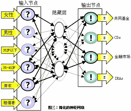假設(shè)該集團的數(shù)據(jù)組包括了100000個現(xiàn)有和潛在的顧客。數(shù)據(jù)組中所有成員至少滿足一個列示于每個輸出節(jié)點邊上的特征條件,比如說,他們的年齡小于35歲或者是在35-40之間,男性或者女性,房東或者租借人。BPN從所有的輸入節(jié)點中獲得數(shù)據(jù),并且以此編譯一個預(yù)測型模型。這個簡單的模型告訴使用者,年齡在35-40歲之間的男性房東最有可能購買共同基金和金融市場產(chǎn)品。這是BNP能預(yù)測的信息。