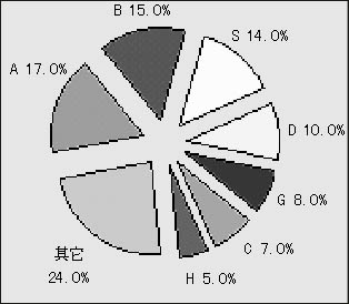 圖2 2003年中國(guó)××軟件市場(chǎng)品牌市場(chǎng)結(jié)構(gòu)(假設(shè))