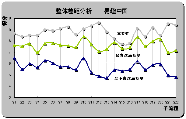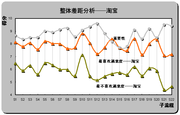 2) 重要流程欠缺最優(yōu)體驗(yàn)。雖然易趣中國被認(rèn)為是最不喜歡的在線銷售網(wǎng)站,但從滿意度評(píng)分也同時(shí)可以發(fā)現(xiàn),易趣中國在S1(瀏覽速度),S16(個(gè)人定制促銷信息的發(fā)布)和S15(個(gè)性化頁面設(shè)置)還是為用戶設(shè)計(jì)了相對(duì)較好的體驗(yàn)。但重要性得分排名前三位的子流程中,S12(產(chǎn)品質(zhì)量可靠)、S21(退換貨服務(wù))和S22(客戶投訴和反饋)仍為重要性與滿意度差距最大的三個(gè)子流程,易趣中國也未在重要流程上為用戶設(shè)計(jì)優(yōu)越的在線體驗(yàn)。