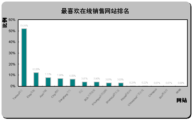 China和貝塔斯曼BOL成為“最不喜歡在線銷售網(wǎng)站”的前兩名,分別有19.77%和18.40%被調(diào)查者選擇易趣和貝塔斯曼作為“最不喜歡在線銷售網(wǎng)站”,兩家網(wǎng)站以相對(duì)較大的比例領(lǐng)先與其他各在線銷售網(wǎng)站。雖然淘寶以巨大的優(yōu)勢(shì)成為“最受歡迎的在線銷售網(wǎng)站”,但同時(shí)也可以發(fā)現(xiàn),仍有8.08%的被調(diào)查者選擇淘寶作為“最不喜歡在線銷售網(wǎng)站”,其它“最不喜歡在線銷售網(wǎng)站”比例相對(duì)較大的還有為當(dāng)當(dāng)(7.79%)。