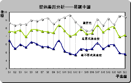 從前面分析可知,易趣以19.77%的比例成為最不喜歡在線銷售網(wǎng)站,選擇被調(diào)查者對(duì)子流程評(píng)分——最喜歡、最不喜歡在線銷售網(wǎng)站滿意度曲線與重要性曲線進(jìn)行差距分析。