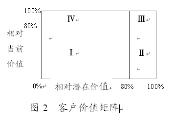 (二)確定客戶當(dāng)前相對價值和客戶相對潛在價值通過預(yù)測,識別出了客戶當(dāng)前價值CCV和增值潛力CPV。但是,這兩個維度指標(biāo),均以絕對價值形式出現(xiàn)對客戶進行細分并不理想(張國方,金國棟,2003(3)),在一定程度上會影響到理論應(yīng)用的方便性(簡便性)。因此,可以采用更加明了和更具有實踐操作性的維度指標(biāo)——客戶當(dāng)前相對價值和客戶相對潛在價值!翱蛻舻南鄬Ξ(dāng)前價值”是指某一客戶提供的當(dāng)前價值與企業(yè)未來可望實現(xiàn)的當(dāng)前價值總額的比值;而“客戶的相對潛在價值”是某一客戶提供的增值價值與企業(yè)未來可望實現(xiàn)的全部最大增值價值的比值。