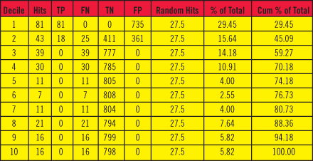 Decile-分組序號;Hits-命中數(shù),即每組內(nèi)包含的實際響應數(shù),等于TP+FN;